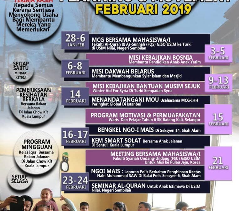 Berkat sokongan dan sumbangan sahabat-sahabat dan para penderma serta keizinan dari Ilahi, MCG telah berjaya mewarnai bulan Februari 2019 lalu dengan berbagai program berbentuk pendidikan, dakwah, kebajikan, kemanusiaan, pembangunan kemudahan ummah dan seumpamanya baik di dalam mahupun di luar negara. Terima kasih kepada sahabat-sahabat dan semua penderma. Tanpa sokongan dan sumbangan ini, ianya adalah sukar buat kami MCG menjayakan usaha-usaha membantu ummah di merata pelusuk dunia.